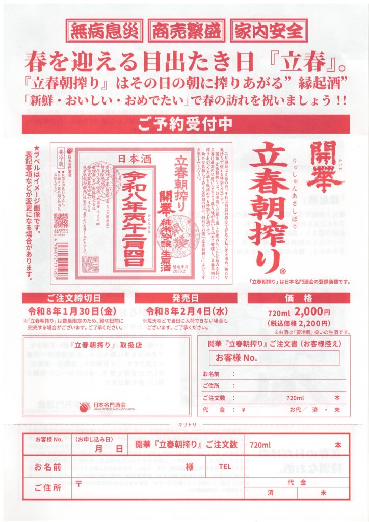 2026.01.09 入荷情報 【2026 開華 立春朝搾り】ご予約フォーム ☆本年の発売日は2月4日水曜日となります。通常水曜日は定休日とさせていただいておりますが、当日は休まず営業させていただきます。 ご注文は下記のリンクよりhttps://forms.gle/SB1iRv7Mg6jzdz5w7 PREV all